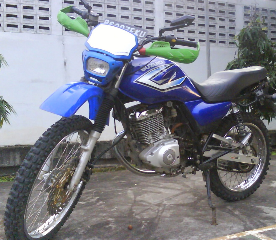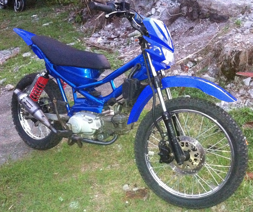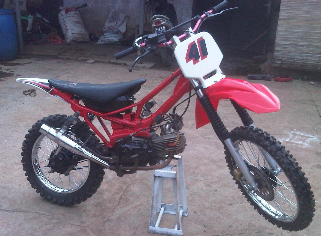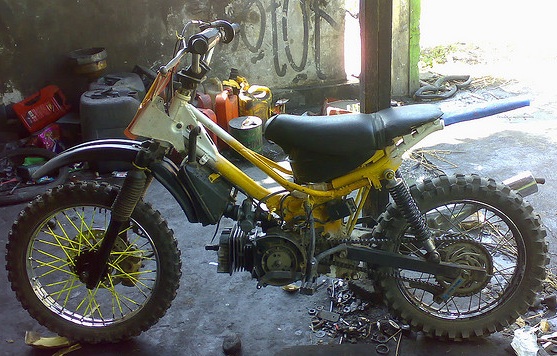 Tapi bagi pencinta trail berkantong cekak, beli motor sport seken juga masih terasa mahal, maka jadilah motor bebek sasarannya. Sementara darah sudah menggelegak ingin “Nrabas”, maka yang punya motor-moo nganggur, terutama yang enteng seperti bebek 2 tak, akhirnya dimodif jadi motor trail jadi-jadian atau biasa kita kenal dengan trail odhng-odhong. Di daerah kami sudah banyak yang jago modif trail, terbukti dengan banyaknya motor hasil modif berseliweran di jalan. Kira-kira penampakannya seperti ini.